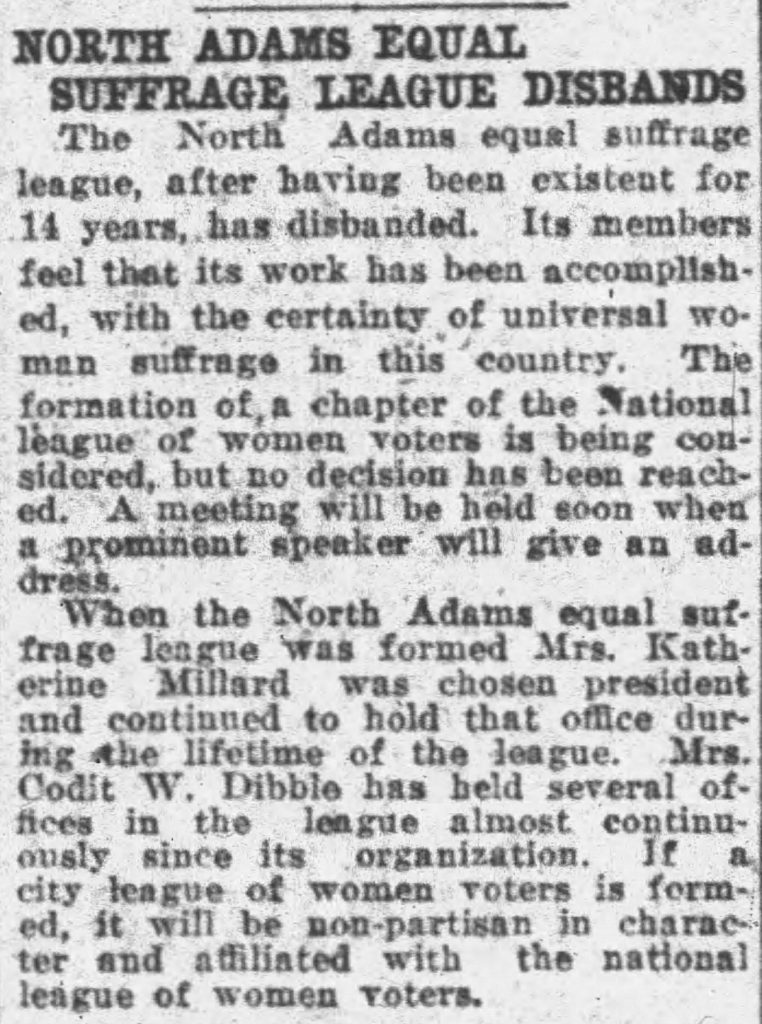 And thanks to Anne Crider for the following information on the League: “The North Adams Equal Suffrage League existed for 14 years before it disbanded in August of 1920. It was formed by Katherine Millard, who was chosen as president and held the position for the entire time the League existed. Another active woman in the League was Mrs. Condit W. Dibble.”
