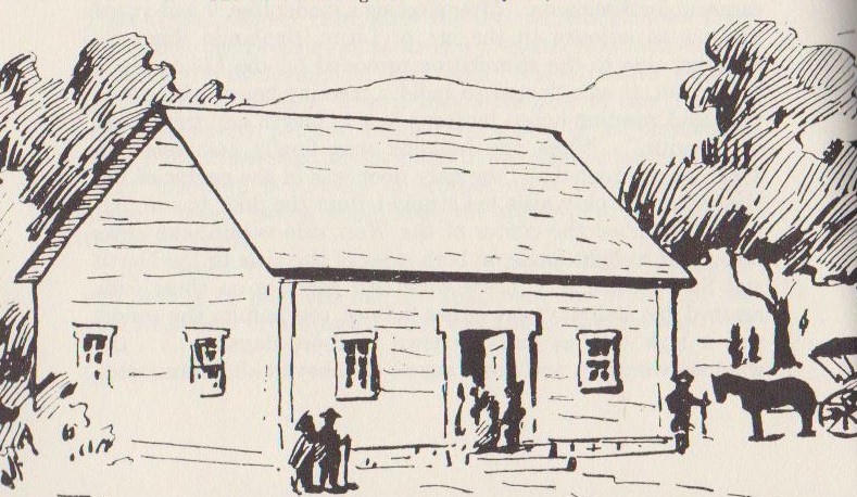 Perry tells us this: “The ridge pole ran north and south the longer way of the building, which was 40 feet. The roof was plain, without belfry, or tower, or other protuberance whatever. The only door was in the centre of the east side; the only aisle led straight from the door to the pulpit, which filled the center of the west side within; the pews rose up at a slight angle on both sides of the aisle to the north and south ends, which were thirty feet each; there were two galleries on these ends, reached by stairways on either side of the pulpit; the pulpit was a high one, as was universal in those days, and the preacher preached at right angles to the people; that is to say, the audience on the south side of the aisle below and above fronted [faced] exactly the audience on the north side below and above; it is no more than charity allows us moderns to infer, that the young people (perhaps the old ones too) watched each other more than they watched the minister (this author’s italics). The windows were few, and there was no chimney at all, consequently the room was relatively dark and cold; the site was high, in the middle of Main Street and at the junction of that with two cross streets, exposed to all winds in all weathers, but somewhat protected, after all, in the fact that there was no door or other opening on the west side or either end.”